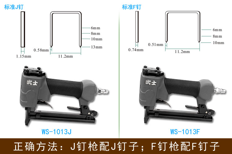 所以,因為“J釘要比F釘寬”,1010J的釘子,只能用在1013J氣釘槍;1010F的釘子,也只能用在1010F或1013F氣釘槍上。我們在購買釘子時,應該是買J釘配J氣釘槍;F釘配F氣釘槍”,千萬別混用了。