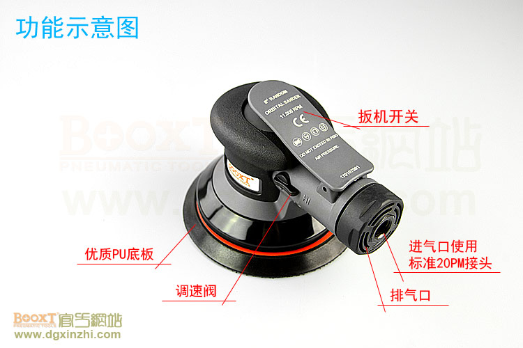 • 產(chǎn)品參數(shù): 底盤尺寸:5寸(125mm);轉(zhuǎn)速:11000rpm;偏擺:2.5mm;重量:0.78kg;使用氣壓:0.65Mpa;推薦氣管:內(nèi)徑8mm;耗氣量:0.53立方米/分鐘,使用時(shí)多加氣動(dòng)油保養(yǎng)。