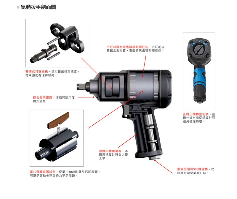 氣動(dòng)板手特點(diǎn):(塑鋼外殼,強(qiáng)度更高不變形,提高耐用度)