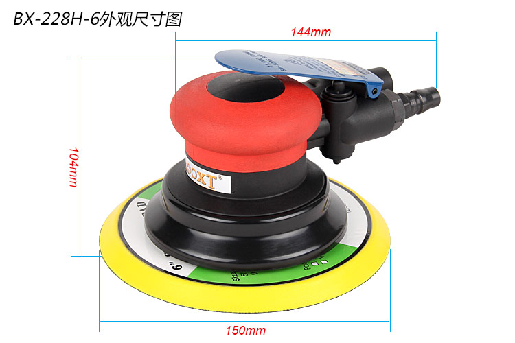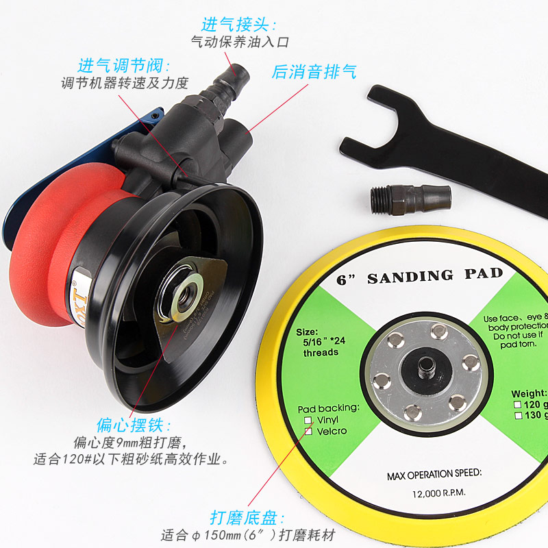 • 產(chǎn)品參數(shù): 底盤(pán)尺寸:150mm 空載轉(zhuǎn)速:11000rpm 偏擺直徑:9mm 重 量:0.9kg 耗 氣 量:1.6cfm/min(粗磨)