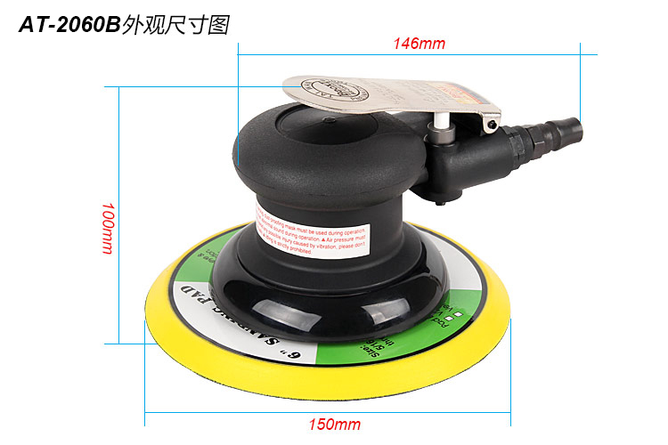 • 產(chǎn)品參數(shù): 底盤尺寸:150mm (6寸) 空載轉(zhuǎn)速:12000rpm 偏擺直徑:5mm 重 量:0.86kg 耗 氣 量:0.48M3/min 噪 音 值:75db (中磨)
