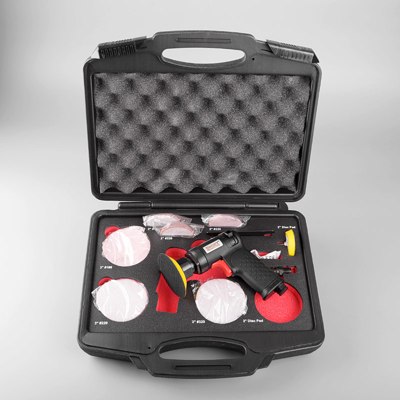 1.帶偏心式,裝砂紙打磨出來的效果是“霧”狀,帶細小亂絲的小紋路,適合后工藝需要做噴砂、烤漆,增加附著力。(標配一般為3mm偏擺,可選配1.5mm,0.75mm偏擺度)