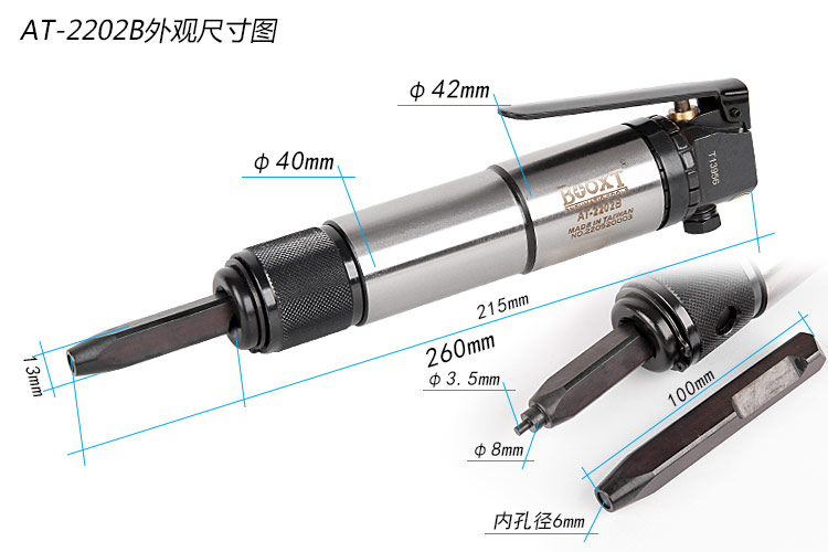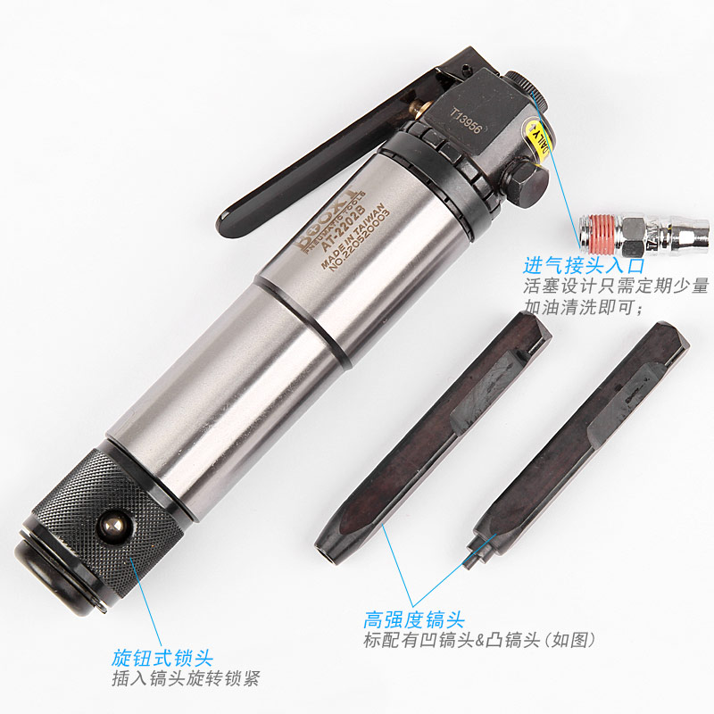 • 產(chǎn)品參數(shù): C型銷直徑:2-6mm 開口緊度:0.2-0.5mm 沖擊頻率:5000次/min 活塞沖程:33mm 耗 氣 量:3cfm 機(jī)器長度:215mm 帶頭長度:260mm 重 量:1.62kg