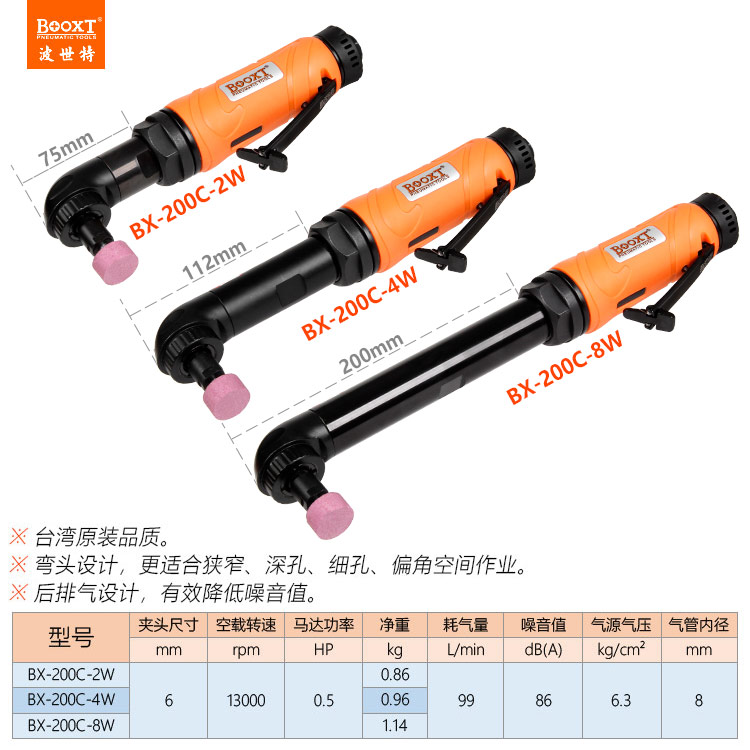 東莞市強勁五金工具有限公司提供臺灣BOOXT波世特品牌氣動工具,彎頭氣動風磨機BX-200C-8W廠家直銷,首件享特價。咨詢熱線:4008301980
