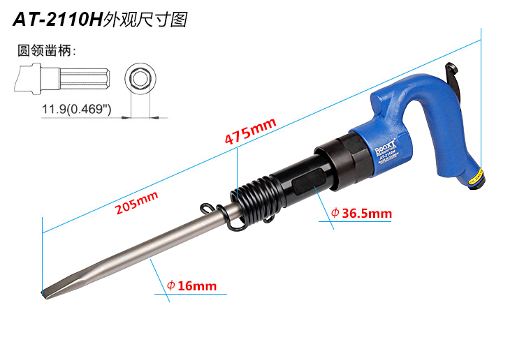 • 產(chǎn)品參數(shù): 鎬尖尺寸:H11.9*250L*20W 【標(biāo)配/扁鎬頭】 活塞直徑:20*48mm 活塞沖程:58mm 打 擊 數(shù):3000bpm 帶鎬全長(zhǎng):475mm 含鎬重量:2.16kg (含鎬頭) 耗 氣 量:7.4cfm 【六角柄】