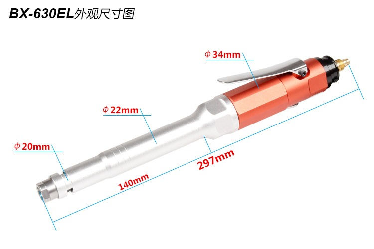 • 產(chǎn)品參數(shù): 夾頭能力:M3,M6 空載轉速:35000rpm 加長長度:140mm 加長桿直徑:22mm 全 長:297mm 重 量 : 0.58kg 耗 氣 量:0.18m3/min 【強力型】