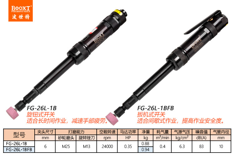 東莞市強(qiáng)勁五金工具有限公司提供臺灣BOOXT波世特品牌氣動工具,高精密氣動直磨機(jī)FG-26L-1B廠家直銷,首件享特價。咨詢熱線:4008301980