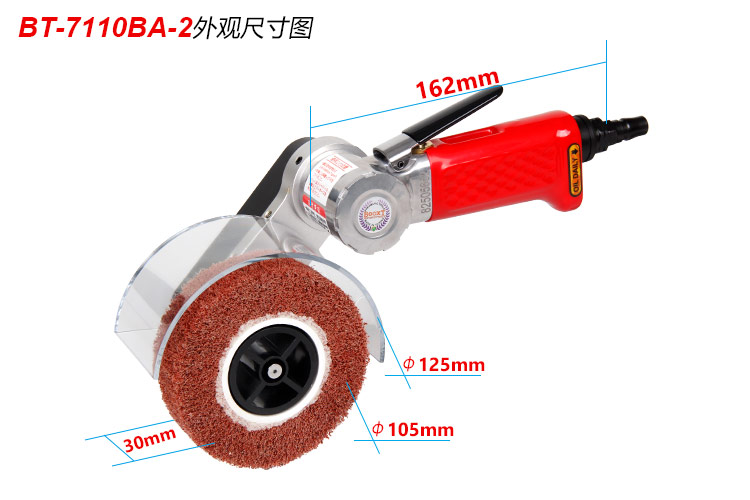 • 產(chǎn)品參數(shù): 拉絲輪尺寸:30*105mm 空載轉(zhuǎn)速:7000rpm; 工具長度:162mm; 工具重量:1.05kg; 馬達功率:0.5HP; 耗 氣 量:0.65m3/min; 使用工作氣壓:0.65Mpa; 推薦使用內(nèi)徑8mm氣管; 平時使用應(yīng)多加氣動油保養(yǎng). 【經(jīng)濟型】