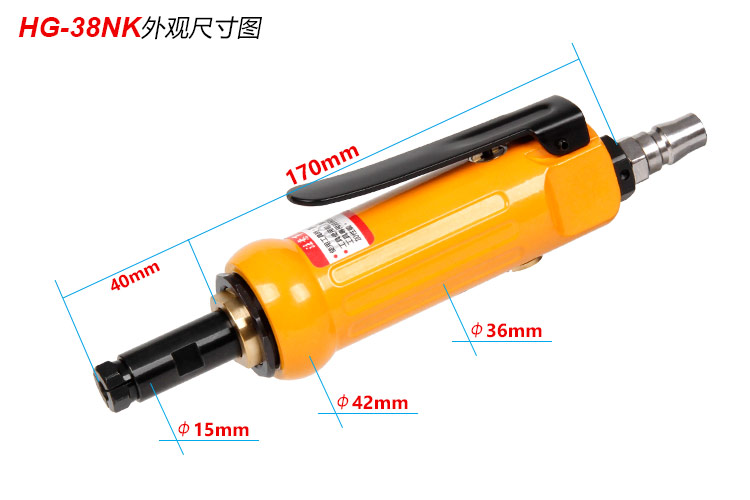 • 產(chǎn)品參數(shù): 夾頭能力:M6 【可選配M3夾頭】 空載轉(zhuǎn)速:22000rpm 細(xì)桿直徑:15mm 細(xì)桿長度:40mm 全 長:170mm 重 量 : 0.54kg 耗 氣 量:0.45m3/min 【細(xì)桿/專業(yè)型】