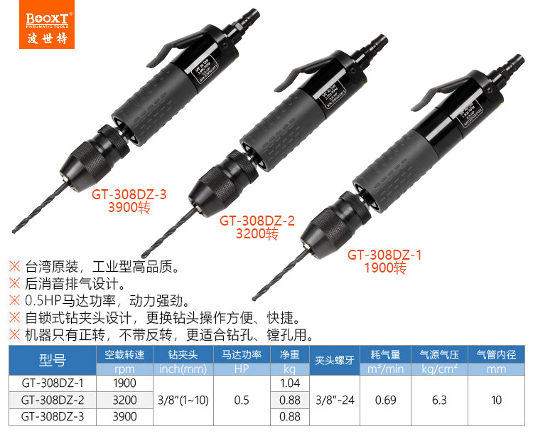 東莞市強(qiáng)勁五金工具有限公司提供臺(tái)灣BOOXT波世特品牌氣動(dòng)工具,自鎖夾頭風(fēng)鉆GT-308DZ-2廠家直銷(xiāo),首件享特價(jià)。咨詢(xún)熱線:4008301980