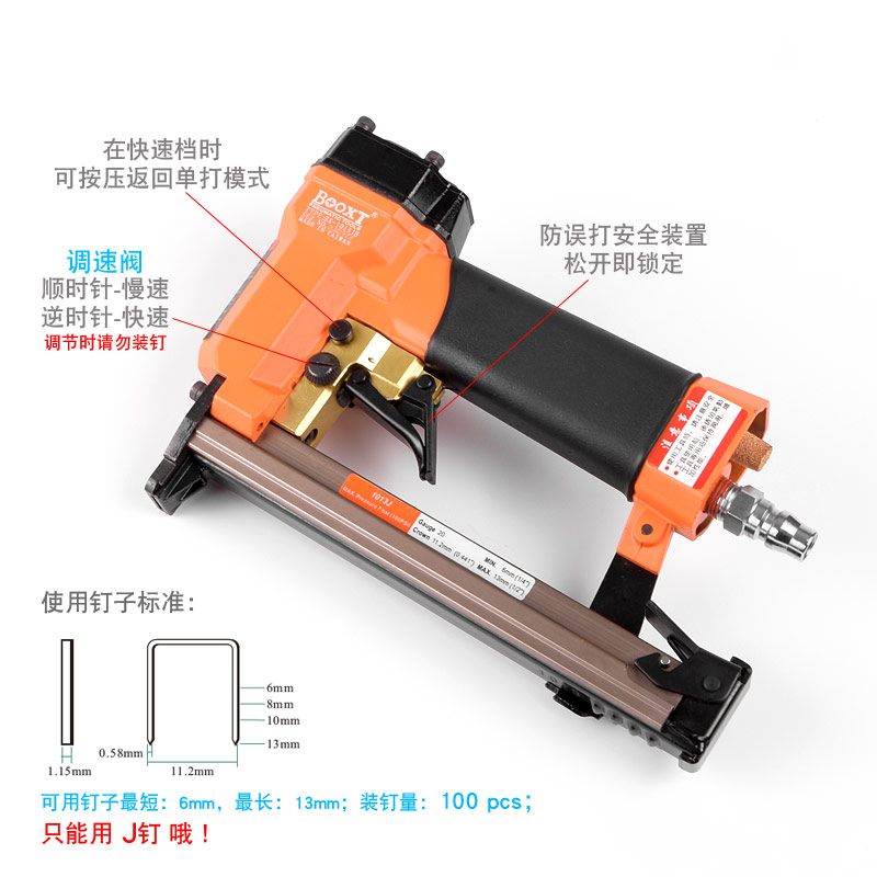 • 產(chǎn)品參數(shù): 特點(diǎn):可調(diào)節(jié)快速連打,自帶防誤打安全開(kāi)關(guān);釘子寬度:11.2mm;釘子跨度:10mm;釘腳尺寸:0.58×1.15mm;使用釘子長(zhǎng)度范圍:6-13mm;裝釘量:100個(gè);使用工作氣壓:0.6Mpa;推薦使用內(nèi)徑6.5mm氣管;平時(shí)多注意定時(shí)排放空壓機(jī)水份